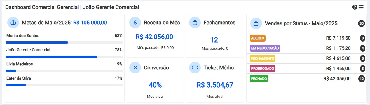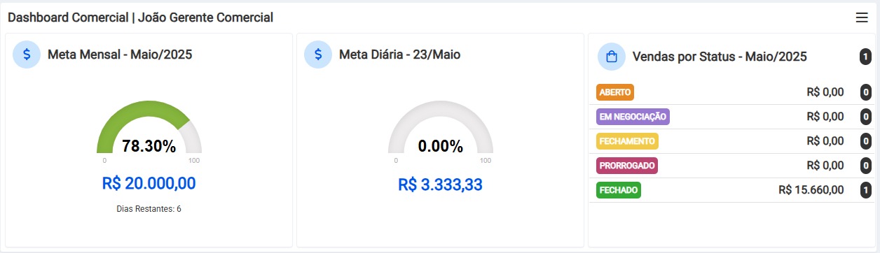 Além disso, cada um dos seus vendedores têm acesso a um dashboard exclusivo que resume as principais informações sobre o desempenho de suas atividades comerciais, como a porcentagem cumprida da meta de vendas mensal e diária, além dos status das vendas dos mês.