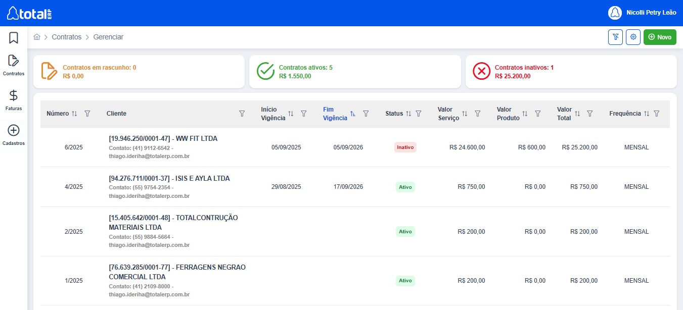 Desenvolvida para atender às particularidades das empresas de prestação de serviços, como no caso das de segurança, o TotalERP oferece um módulo completo para gestão de contratos recorrentes. A solução foi projetada especificamente para o faturamento automatizado de serviços, indo além de adaptações de sistemas genéricos.