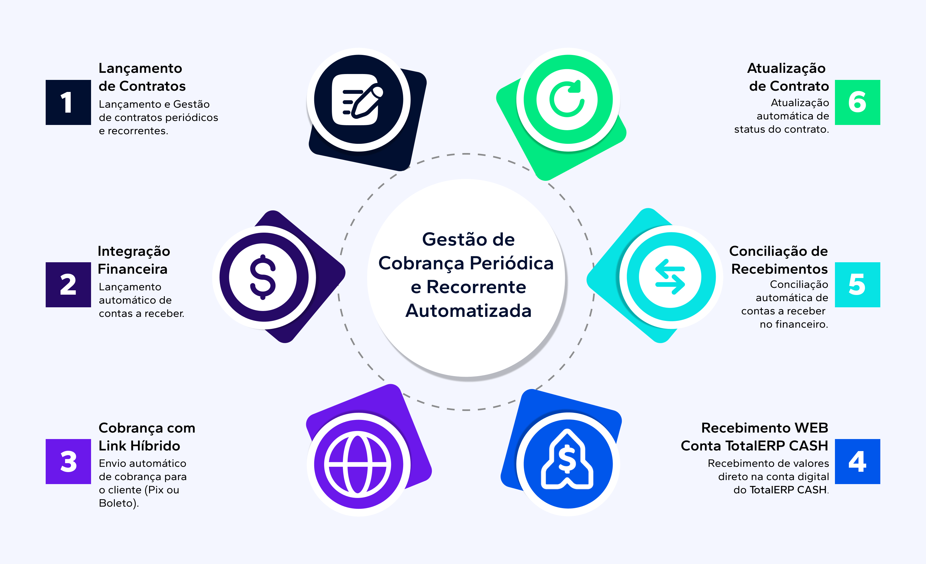 Na imagem, ciclo de automação financeira no módulo de gestão de cobranças recorrentes do TotalERP.